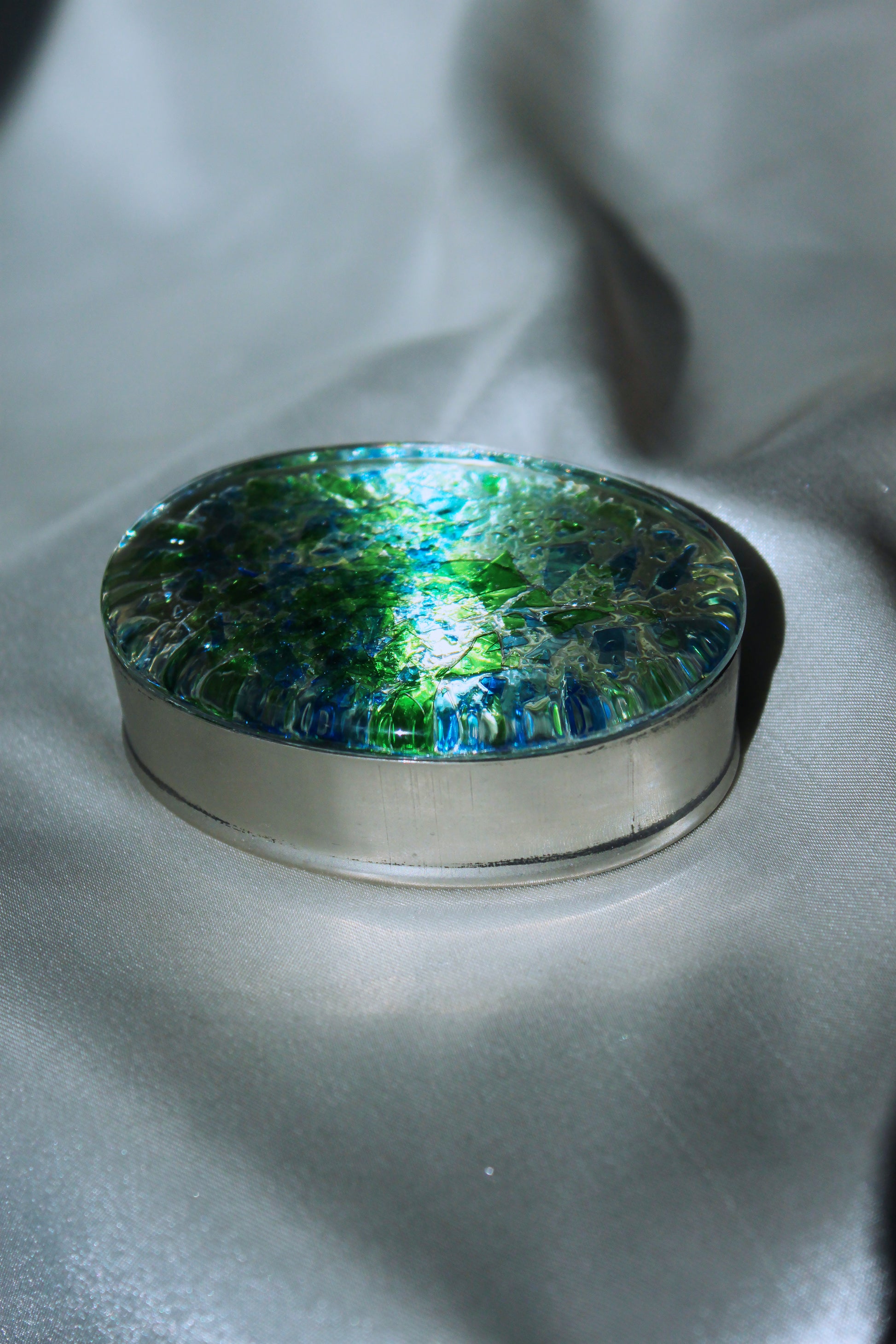 Boîte à bijoux en verre de Murano coloré et métal argenté 800, années 70-80, avec le tampon Acquachiara et Vetri Murano Effetre International
