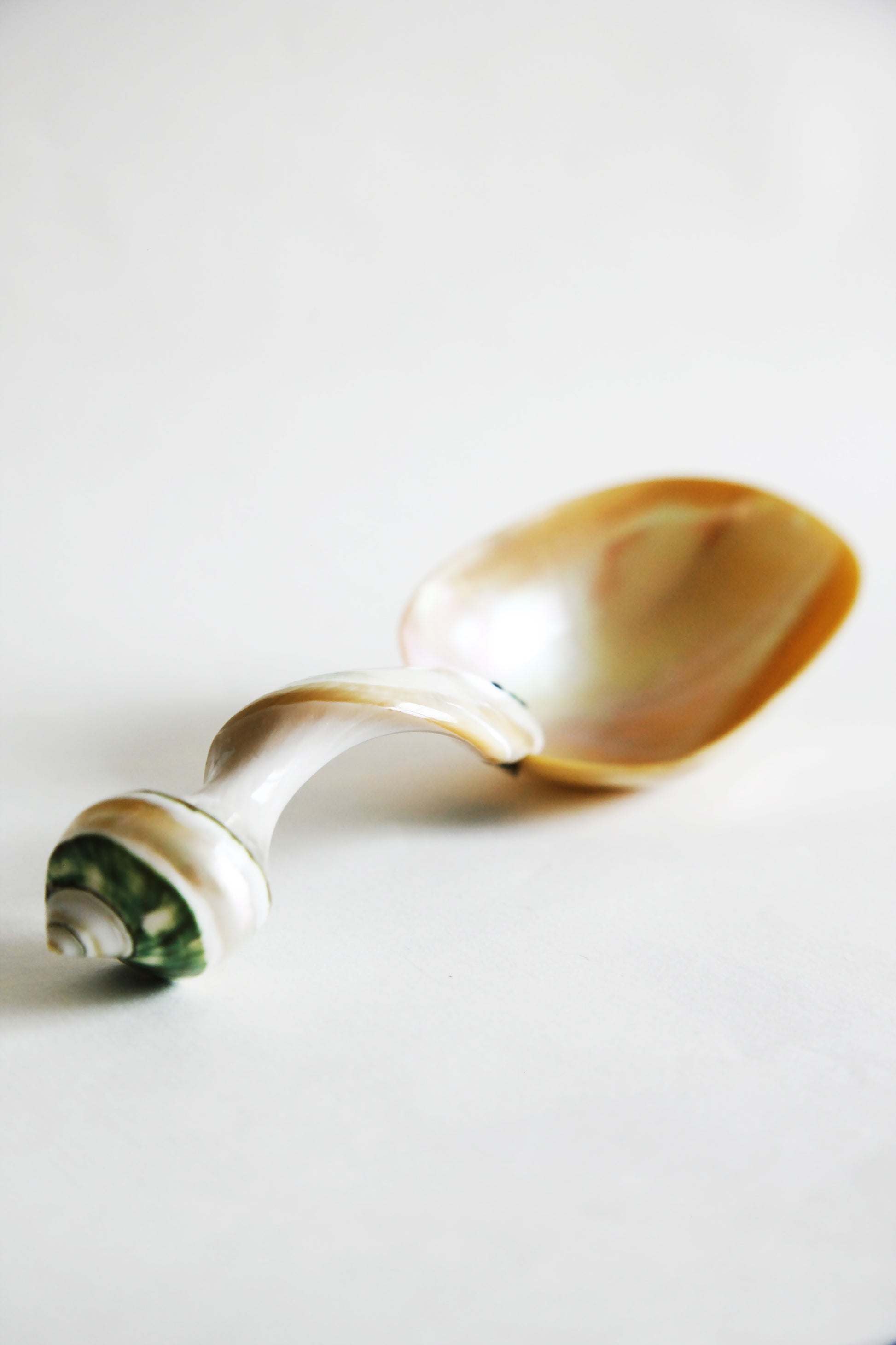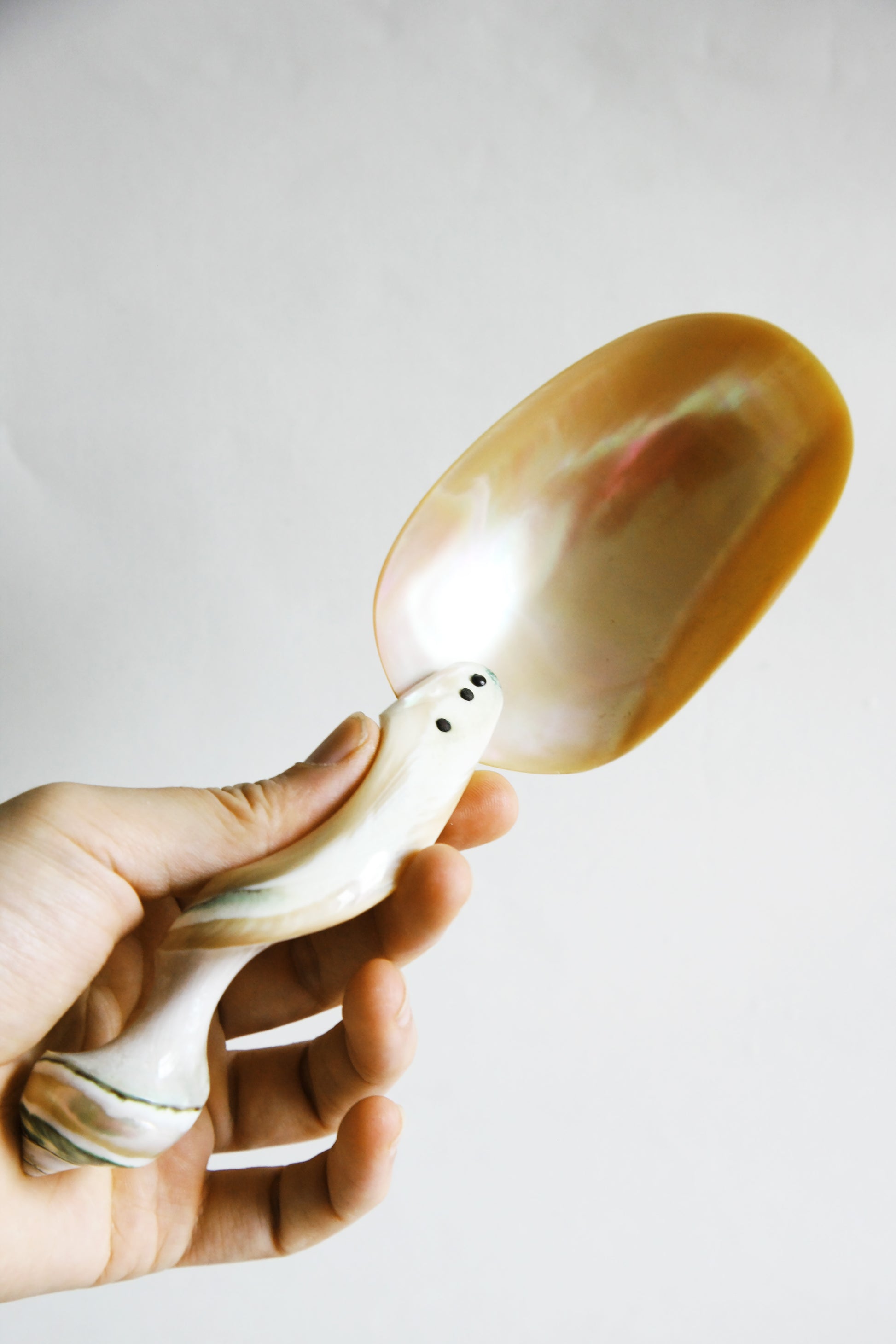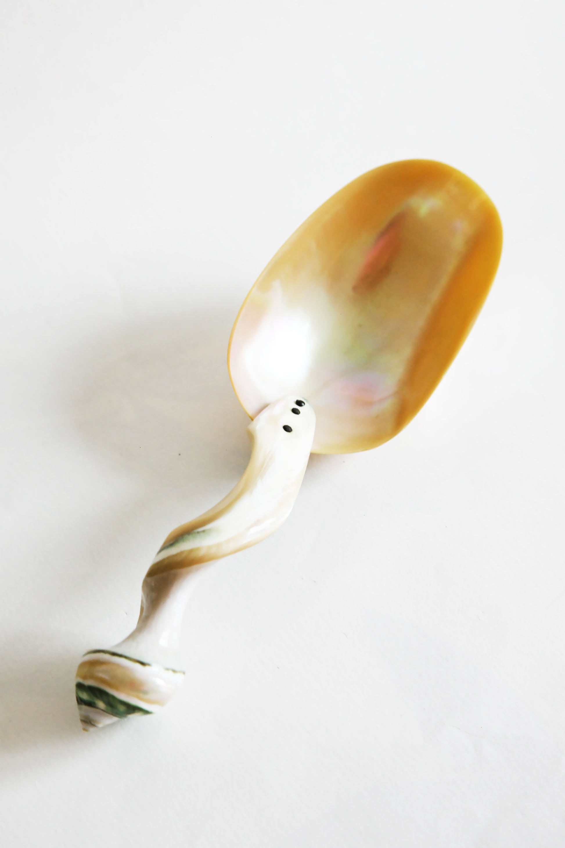 Grand cuillère à caviar en nacre. Le manche finement sculpté dans le squelette d’un coquillage.