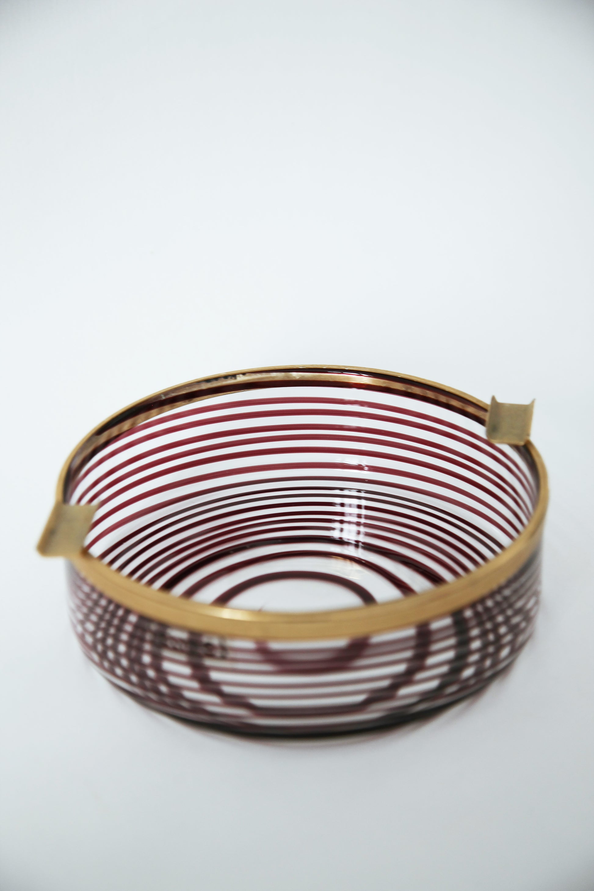 Grand cendrier en verre avec bord en laiton et décor peint en spirale violette.