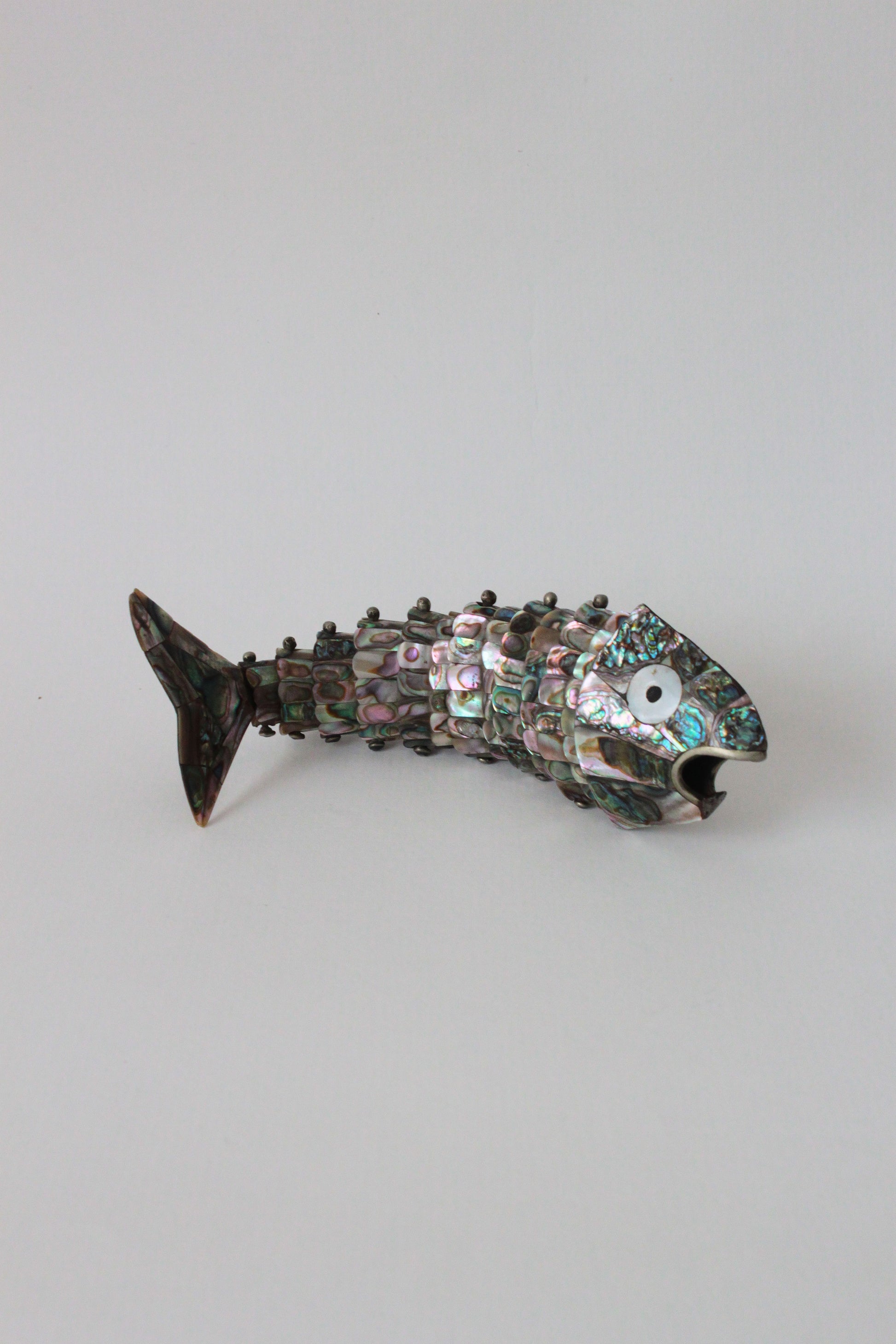 Décapsuleur articulé en forme de poisson, en écailles de nacre dans le goût du designer Los Castillo.